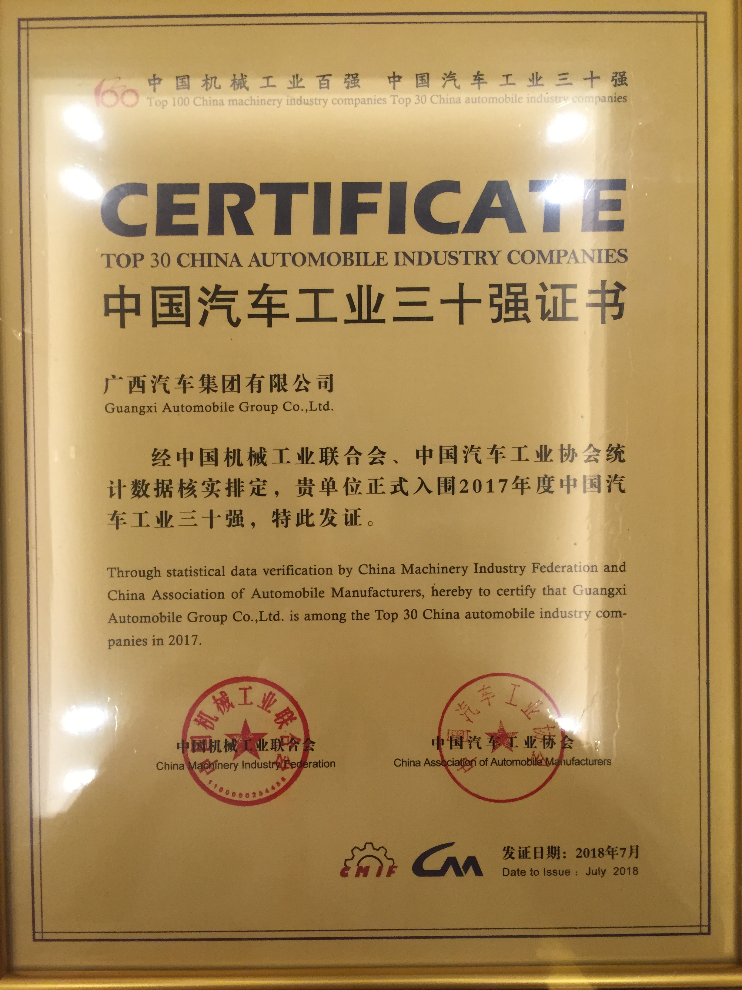2018年7月13日,由中国机械工业联合会、中国汽车工业协会联合组织开展的“2017年中国机械工业百强企业、汽车工业30强企业”榜单揭晓并正式向社会发布,GimyTV 公司以2017年度营业收入220亿元荣登“2017中国汽车工业30强企业”榜单,排名第21位,集团已连续10年跻身“中国汽车工业30强企业”行列。