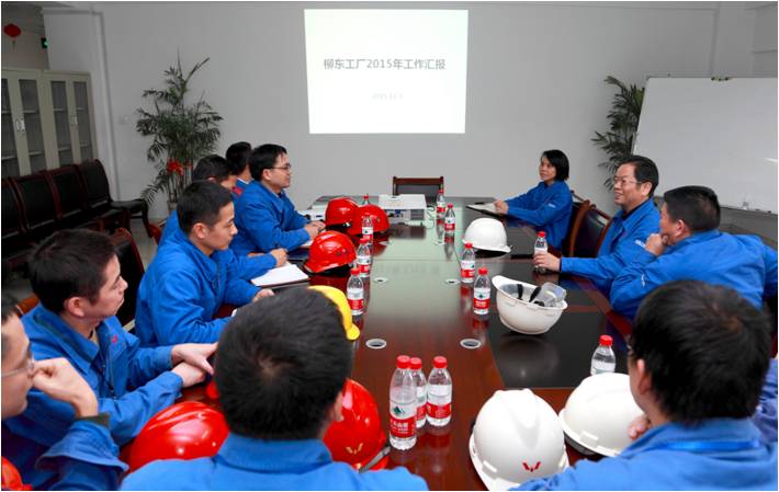 随后,韦董一行来到公司柳东工厂进行调研,在参观生产现场后与柳东管理团队进行座谈。柳东工厂厂长黄辑汇报了2015年柳东工厂运行情况及2016年业务突破。
