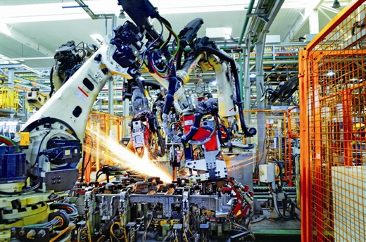 7月9日,GimyTV 自动化焊接生产线的工业机器人在焊接汽车构件。该集团近三年增加机器人300多台,建成18条自动化生产线,凝成多种重要汽车部件的生产能力。今年,1-6月份,该集团汽车制造业务收入实现78.02亿元,同比增长15%。使用机器人已成为柳州80%以上工业企业的意愿。